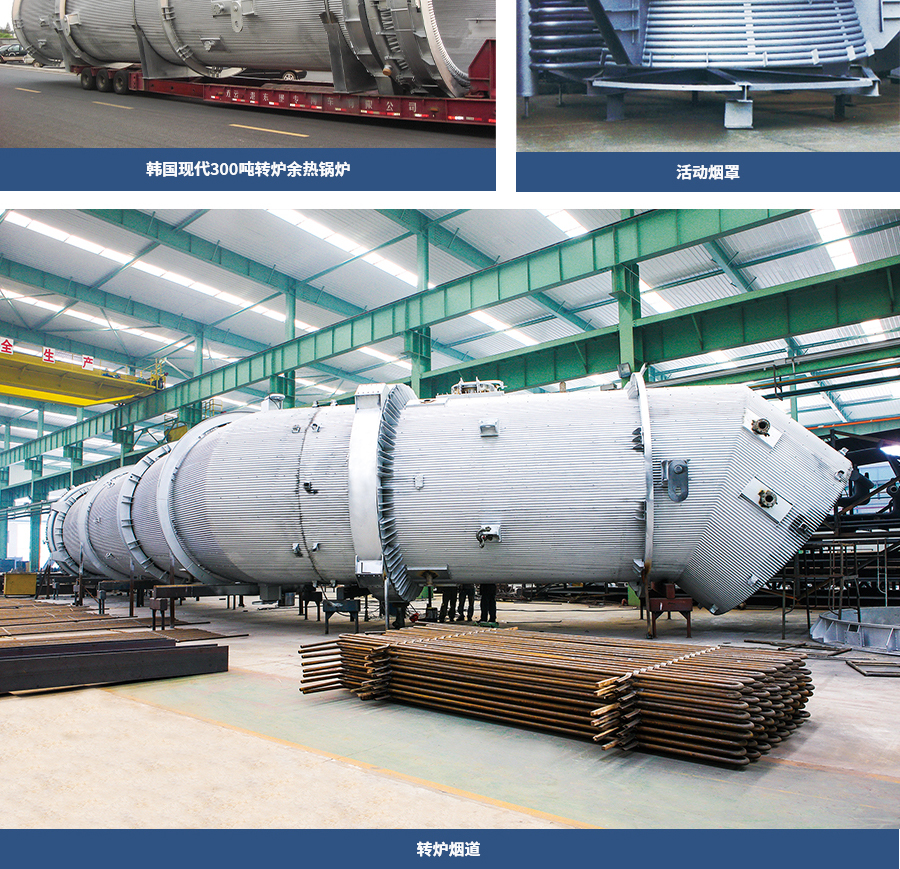 從1990年開始設計制造煉鋼轉爐容量從15噸到300噸轉爐的煙道。煙道壓力從0.8Mpa~4.0Mpa。循環方式一般為:容量80噸轉爐煙道以下為自然循環,容量80噸轉煙道以上為自然循環+強制循環,業績超過250套;除了滿足國內市場的需要(中國市場占有率80%以上)同時出口到韓國(浦項,現代),美國(美鋼聯)等。 項目實景